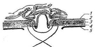Второй способ Оливкова. При этом способе широкие грыжевые кольца закрывают путем гофрировки грыжевого мешка. Для получения последней грыжевой мешок прошивают несколькими длинными нитками на одинаковых расстояниях одна от другой, концы которых проводят через края грыжевых ворот. При стягивании концов лигатур грыжевой мешок собирается в складки (гофрируется) и закрывает просвет грыжевого кольца.