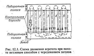 На коротких гонах, чтобы сократить время на повороты, применяют беспетлевой комбинированный способ движения агрегата. При этом способе получается большое количество свальных гребней и разъемных борозд, которые потом необходимо заравнивать дисковыми боронами или другими средствами.
