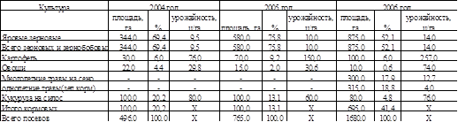 Структура посевных площадей в период с 2004 по 2006 г изменилась следующим образом: площадь зерновых культур увеличилась в 1,5 раза, картофеля на 60%, овощей на уменьшилась более чем в 2 раза, а так же в 2006 году были введены кормовые травы. Общая площадь посевов увеличилась в 4 раза.