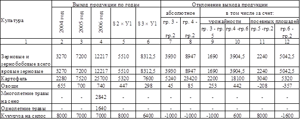 Производство продукции зависит от размеров и структуры посевных площадей и от урожайности культур. Отклонение выхода продукции в большую сторону наблюдается при увеличении площади посева или урожайности культуры, в меньшую сторону – при снижении урожайности, уменьшении площади.