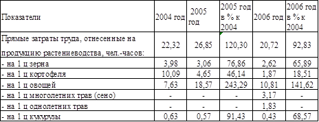 Как видно из таблицы 11 наблюдается снижение затрат труда по производству всех видов продукции, исключение составляют овощи. Так на производство 1 ц картофеля в 2006 году затраты труда в 5 раз ниже, чем в 2004 году. Затраты труда на производство овощных культур в 2006 году составляют 141 % от уровня 2004 года.