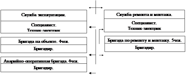 Энергетическая служба хозяйства, которой руководит ведущий инженер-электрик подразделяется: на службу эксплуатации и службу ремонта и монтажа, которыми в свою очередь руководят техник-электрик и техник-электрик, подчиняемые непосредственно ведущему инженеру-электрику. В службу эксплуатации входит 2 бригады: аварийно – оперативная и бригада на объекте, которыми руководят электромонтёры высших разрядов (5 – го). В службу ремонта и монтажа входит ремонтно – монтажная бригада, которую возглавляет электромонтёр 6 – го разряда.