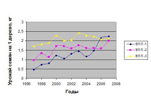 Анализ результатов исследования показал, что орехопродуктивность сосны сибирской за 11 лет на разных площадках исследования в природном парке «Самаровский чугас» колеблется от 0,47 кг на 1 дерево (ВПП-1, 1997 г.) до 2,42 кг на 1 дерево (ВПП-3, 2003 г.). На ВПП-1, где возраст сосны сибирской составляет 50 лет, в целом за 11 лет орехопродуктивность сосны сибирской возрастает, за исключением 2001 г. и 2004 г. На ВПП-2 с 2000 по 2006 г.г. орехопродуктивность изменяется незначительно и 2007 году возрастает до 2 кг на 1 дерево. На ВПП-3 орехопродуктивность возрастет до 2003 г., а затем снижается.