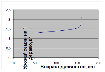 Возраст сосны сибирской – важный фактор, который оказывает влияние на урожайность орехов. Это подтверждается и нашими данными. Но, по мнению многих авторов, имеется большой период возраста, на протяжении которого кедровники плодоносят однотипно. Так, в среднем от 140 до 250 лет заметного влияния возраста на урожайность почти не прослеживается.