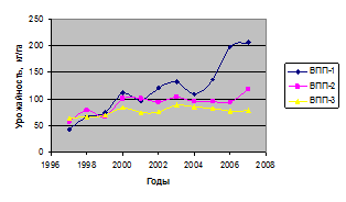 Согласно шкалы урожайности для сосны сибирской, разработанной Т.П. Некрасовой (табл. 3.1.), на ВПП-3 урожай сосны сибирской характеризуется как хороший, а в некоторые годы как отличный. На ВПП-1 и ВПП-2 урожай сосны сибирской оценивается как средний или хороший и только с 1997 по 1999 г.г. – как слабый или средний.