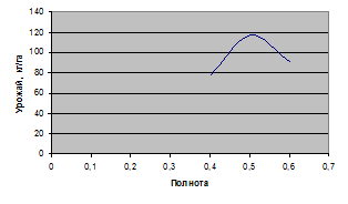 Зависимость урожая сосны сибирской от полноты древостоя представлена на рис. 5.