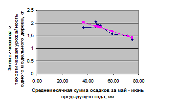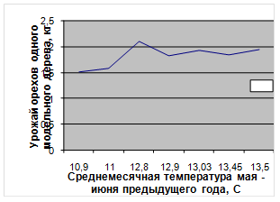 На графике видно, что при повышении средней температуры в мае – июне предыдущего года повышается урожай орехов с одного дерева.