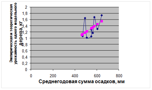 Кроме того, нами была проанализирована зависимость орехопродуктивности сосны сибирской от среднегодовой суммы осадков (рис.8) .