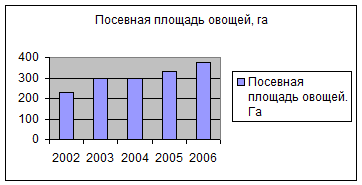Таким образом, в исследуемом хозяйстве наблюдается тенденция к увеличению размера посевных площадей, занятых овощными культурами. В 2005 г. показатель достиг 330 га, между тем, в научной литературе отмечается, что наилучших экономических результатов добиваются хозяйства с посевными площадями размером 300 га и более. Проследим динамику посевных площадей овощных культур графически.