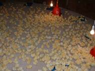 Максимальное количество корма, ежедневно предлагаемого птице, должно быть не больше суточной нормы, чтобы исключить возможность его скопления в кормушках и потребление птицей несвежего корма. Обычно, в течение первых 5-6 дней ремонтный молодняк кормят так же как бройлеров - adlibitum, т.е. без ограничения. Корм для развития аппетита подаётся часто, малыми порциями 5-6 раз в день. Вода цыплятам должна поступать без ограничения, помимо штатных поилок птичника в этот период используются дополнительные поилки. Достаточно часто приходится встречать выпойку глюкозы в первые дни, мы не считаем это правильным, поскольку глюкоза подавляет у цыплят аппетит и вызывает дегидратацию, а цель, которую мы преследуем в ранний период выращивания это - стимуляция у птицы естественного аппетита. В течение первых 24-48 часов освещение должно быть постоянным с интенсивностью светового потока в 100 люкс. В последующем интенсивность света брудеров должна постепенно снижаться, так чтобы через 2-3 дня можно было бы полностью перейти на расположенные рядом штатные линии освещения птичника. Нагрев воздуха во всём птичнике, по своей сути, не многим отличаются от точечного нагрева воздуха, однако поведение цыплят в качестве индикатора удовлетворительной температуры при этом температурном режиме не является столь очевидным, как при точечном, поскольку при нём в птичнике не имеется чётких источников тепла. В этом случае от персонала требуется определённое внимание, для понимания поведения цыплят. Зачастую единственным индикатором неблагоприятных для цыплят условий будет являться птичий шум. Возможно, что птицы будут собираться в той части здания, где температура наиболее соответствует их потребностям. На рисунке 3 показана скученность цыплят при слишком низкой температуре воздуха в птичнике.