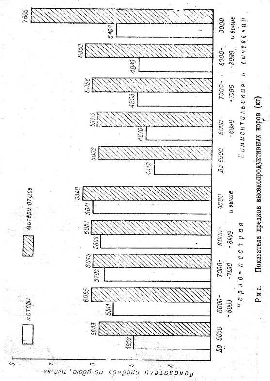 Привлечение информации о продуктивных качествах бабок и прабабок также незначительно повышает надежность отбора ремонтных быков по родословной. Таким образом, оценка производителей по удою ближайших женских предков может быть в отдельных случаях только ориентировочной. Однако в системе селекционной работы нельзя совсем исключить легко осуществимый и доступный каждому специалисту отбор по родословной, так как он останется важнейшим звеном в качестве критерия предварительной оценки быков-производителей перед проверкой их по качеству потомства.