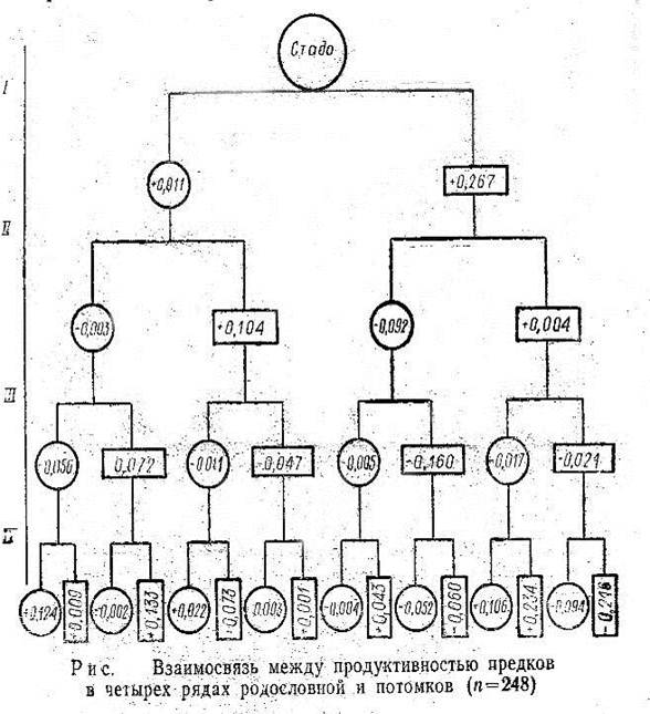 Основные разногласия возникают в оценке влияния предков по мере их удаления в родословной потомка. По видимому, такое распределение доли влияния предков условно и недостаточно для оценки родословной в целом. Один родитель, предок, какими бы высокими продуктивными и племенными качествами он ни обладал, ни в коей мере не определяет ценность родословной. Чтобы подтвердить сказанное, в племзаводе «Сычевка» определили корреляцию между удоем 248 коров и предков в четырех рядах родословной (рис. 3).