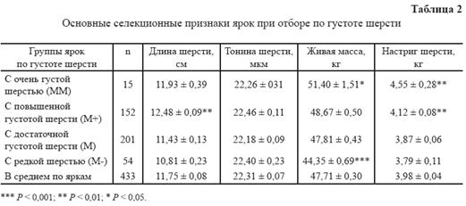 Сохранение в стаде животных с редкой шерстью приведет к снижению живой массы на 7,8 %, настрига шерсти – на 2,1 %, длины шерсти – на 5,7 % и будет сопровождаться огрублением шерсти на 1,0 %. То есть отбор по густоте шерсти будет сопровождаться положительным эффектом по всем основным селекционным признакам при некотором огрублении шерсти.