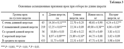 Результаты исследования подтвердили это положение. Так, ярки с очень длинной шерстью превосходили типичных животных по настригу шерсти на 11,3 %, по длине шерсти на 30,6 %, по тонине шерсти на 1,3 % и по живой массе на 4,4 % (табл. 3).