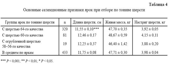Отбор по тонине шерсти имеет менее широкие границы изменчивости и должен осуществляться в пределах одного–двух качеств или 2–4 мкм. Результаты исследования показали, что наиболее желателен отбор овец с тониной шерсти 60-го качества, или в пределах 23,1–25,0 мкм (табл. 4).