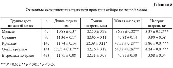 Так, очень крупные ярки превосходили типичных для породы по длине шерсти на 7,8 % (Р < 0,001), тонине шерсти – на 1,4 %; настригу шерсти – 8,7 % (Р < 0,001). Крупные ярки характеризовались повышенной длиной шерсти и достоверно превышали типичных животных по настригу шерсти. Мелкие животные с низкой живой массой уступали типичным животным, соответствующим стандарту породы, по длине шерсти на 4,4 %, по настригу шерсти на 15,7 % (Р < 0,001) и имели более огрубленную шерсть. По сравнению с другими вариантами отбор по живой массе сопровождался более значительным прогрессом по длине шерсти, но меньшим прогрессом по настригу шерсти.