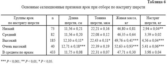 Ярки с очень высоким настригом шерсти превосходили типичных животных по основному признаку на 50,7 % (P < 0,001), по длине шерсти на 9,9 % (P < 0,001), тонине шерсти на 1,4 % и живой массе на 13,5 % (P < 0,001).