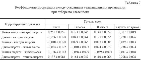 Важную роль в повышении эффективности отбора животных играет изучение характера и величины корреляционных связей между основными селекционными признаками. Известно, что у тонкорунных овец существует положительная корреляционная связь между длиной, густотой, живой массой и настригом шерсти и отрицательная взаимосвязь между густотой, длиной и тониной шерсти. Однако при длительном направленном отборе селекционерам удается изменить не только величину корреляции, но и ее характер. В результате исследования установлено, что направленность отбора в значительной степени сказывается на величине и характере корреляционных связей между признаками. Так, у ярок класса элита при отборе по классности большинство изученных взаимосвязей носило отрицательный характер, а у ярок первого и второго классов – положительный (табл. 7).