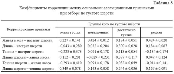 При отборе по густоте шерсти взаимосвязь между живой массой и настригом шерсти у всех производственных групп положительная, но более сильно выражена у редкошерстных и густошерстных овец (табл. 8).