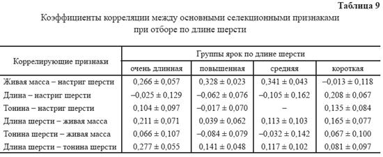 Длина и тонина шерсти связаны положительно во всех группах, самая высокая связь у очень густошерстных ярок. При отборе по длине шерсти величина взаимосвязи живой массы и настрига шерсти ниже, чем в предыдущем варианте, а в группе короткошерстных овец эта взаимосвязь отрицательная и очень низкая (табл. 9).