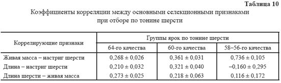Более низкая корреляционная связь длины и настрига шерсти установлена во всех группах ярок, кроме короткошерстных, у которых она отрицательная. Связь тонины и настрига шерсти имеет положительную направленность в группах с крайней выраженностью признака, у ярок с повышенной длиной она низкая отрицательная, а в группе со средним значением признака – отсутствует. Взаимосвязь длины шерсти с живой массой во всех случаях при этом варианте отбора положительная и в большей степени выражена у очень длинношерстных животных. Тонина и живая масса коррелируют слабо и в двух группах – у ярок с повышенной и средней длиной она отрицательная. Характер связи между тониной и длиной шерсти не изменяется, и она остается положительной. При отборе по тонине шерсти самая высокая корреляция отмечается между настригом и живой массой, у ярок с огрубленной шерстью величина этой связи составляет 0,736 (табл. 10).