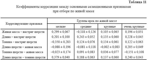 При отборе по живой массе не прослеживается увеличения степени корреляции между живой массой и настригом шерсти, а у ярок со средней живой массой взаимосвязь даже отрицательная (табл. 11).