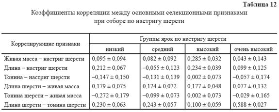 Взаимосвязь длины шерсти с живой массой при этом варианте отбора устойчиво положительная и среднего уровня. При этом она почти в два раза ниже у крупных ярок. Тонина и настриг шерсти имеют относительно высокую, но отрицательную связь у мелких животных и положительную среднего уровня во всех остальных группах. Длина шерсти и живая масса положительно связаны только у очень крупных животных, во всех остальных группах связь отрицательная и низкая. Связь между тониной шерсти и живой массой преимущественно низкая, среднего уровня и отрицательная она только в группе очень крупных ярок. Характер взаимосвязи тонины и длины шерсти не изменяет и этот тип отбора, причем степень взаимосвязи несколько увеличивается. При отборе по настригу шерсти практически отсутствует взаимосвязь его с живой массой. Положительная и среднего уровня эта связь только в группе животных с высокой шерстной продуктивностью (табл. 12).