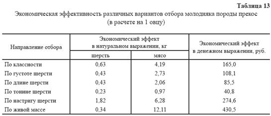 Самый низкий экономический эффект получен при использовании отбора по тонине шерсти: от одной овцы в этом случае дополнительно получают 0,23 кг шерсти и 0,97 кг мяса в живой массе.