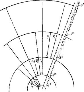 Первые четыре орбиты по боровской модели строения атома водорода.