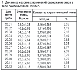 Чтобы проследить сезонные изменения содержания жира в теле медоносной пчелы, с января по декабрь 2005 г. отбирали пробы пчел (50 шт) и проводили анализы методом экстрагирования в аппарате Сокслета в испытательной лаборатории зернопродуктов ГНУВНИИЗ РАСХН (Кубанский филиал) г. Краснодара.