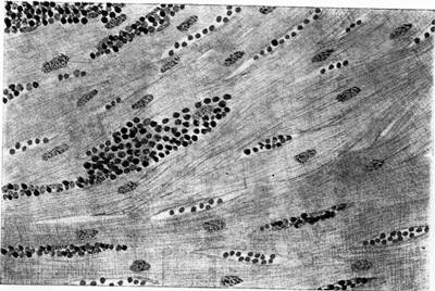 Миокардит. Мышечные волокна в состоянии зернистой дистрофии, между волокнами скопления лейкоцитов и гистиоцитов.