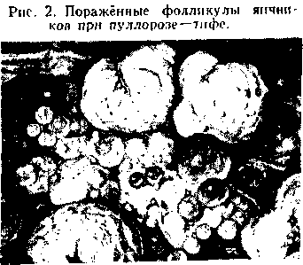 При остром течении обнаруживают резкое увеличение и полнокровие селезёнки, печени, почек, наличие в них очагов некроза, катаральный или катарально-геморрагический энтерит; нерассосавшийся желток, кровоизлияния на оболочке желточного мешка, охряно-жёлтое окрашивание печени. При подостром течении характерны множественные сероватые очаги некроза в сердечной мышце, лёгких, печени, селезёнке, мышечном желудке, отмечают пневмонию, энтерит. В хронических случаях — катаральный энтерит, истощение. Для взрослых кур типичны деформация и перерождение фолликулов яичника (рис. 2), перитонит, множественные некротические очаги в миокарде, печени.