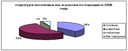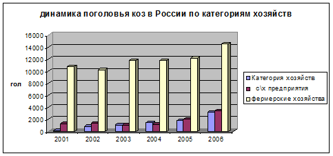 Как было сказано выше, большая часть поголовья молочных коз как и раньше сосредоточена в личных подсобных хозяйствах (68,9%). Видна тенденция увеличения поголовья коз с 2002 года на 4290 головы или 41,9 %, что может быть обусловлено возрастанием потребности в козьем молоке как лечебного продукта, в связи с ухудшением экологической обстановки в стране, увеличением доли пожилых и больных людей, которые не могут по тем или иным причинам потреблять коровье молоко (из-за его непереносимости, аллергии и др.).