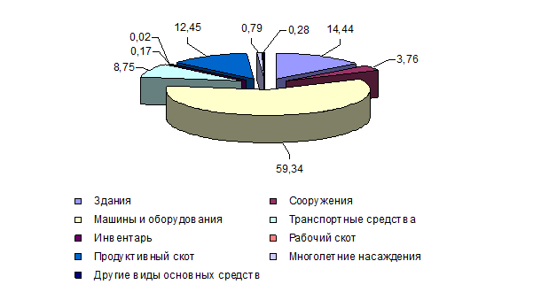Наибольший удельный вес 2010 г. занимают машины и оборудование – 59,34 %, наименьший удельный вес приходится на рабочий скот – 0,02 %.
