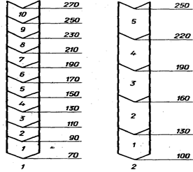Рис. 2. Типовые технологические схема подсочки сосны кедровой: 1 – 10-летней; 2 – 5-летней подсочки.