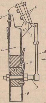 а - открытый сосуд с ножом для прокалывания …….желваков; б - закрытый сосуд; в - инструмент … .конструкции СибНИИЛПа: 1 - сосуд; 2 - …….подрезающий нож; 3 - толкатель 4 –пантографная …….система; 5-кронштейн; 6-тяга; 7-стойка; 8- …… рукоятка; 9-шарнир; 10 - упругая пластина.