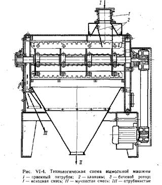 Вымольная машина Al-БВГ и виброцентрофугал РЗ-БЦА сочетают ударно-истирающее воздействие бичей различной интенсивности с процессом просеивания. Ударное воздействие бичей в совокупности с трением между частицами и о ситовую поверхность нарушает связь между оболочками и эндоспермом, способствует измельчению частиц эндосперма. Виброцентрофугал РЗ-БЦА (рис, VI-5) предназначен для высевания муки из трудносыпучих промежуточных продуктов раз мола зерна.
