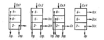 Наиболее перспективны крупяные рассевы, просеивающая поверхность сит которых в 3,5 раза больше, чем у крупосортировок, при несколько меньших габаритах. Крупяные рассевы выполнены на базе шкафного рассева Al-ЗРШ; имеют 14 ситовых и четыре технологические схемы (рис. XI-2). Такие рассевы применяют не только для очистки, но и для калибрования зерна, т. е. разделения его на фракции по размерам, а также для разделения продуктов шелушения, контроля крупы и т. д.