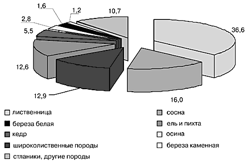 Рисунок 1.1. Распределение российских лесов по группам пород (в % площади)