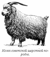 Продуктивность. Шерсть советских шерстных коз по внешнему виду, строению руна, морфологическому составу, прочности и другим техническим свойствам сходна с могером. Животных отличает хорошая оброслость рунной шерстью туловища, шеи и ног. По сравнению с ангорскими козами в их руне содержится больше грубого пуха и меньше переходного волоса. Содержание кемпа составляет 1 - 1.5%. Шерсть советских шерстных коз несколько тоньше и короче могера, но гуще. Различные типы волокон у советских шерстных коз в большей мере отличаются друг от друга по тонине, однако показатели однородности руна сравниваемых пород сходны. Коэффициент неравномерности тонины шерсти ангорских коз составляет 32,76%, длины 20,27%, а шерсти советских шерстных коз соответственно 36,8 и 19,70%. По заключению Центрального научно-исследовательского института шерсти (ЦНИИШ), руна советских шерстных коз в массе относятся к одному двум сортам, что свидетельствует о топографической однородности волокна по тонине на основных частях туловища животных. По совокупности технических свойств шерсть коз новой породы является таким же ценным сырьем для промышленности, как и ангорская.