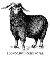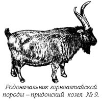 Для ее выведения мелких местных коз отличавшихся невысокой продуктивностью скрещивали с придонскими козлами. Помесей желательного типа второго и частично третьего поколений разводили "в себе" в сочетании с целенаправленным отбором и подбором животных в селекционных стадах. Также, хотя в значительно меньшей степени, применялось сложное воспроизводительное скрещивание помесей ангорских коз (матки) с помесями придонских (козлы). Родоначальником горноалтайских пуховых коз считается козел № 9 (рис. 2.3.), придонской породы, завезенный в 1937 году в колхоз "Мухор-Тархата" Кош-Агачского района Республики Алтай из Сталинградского госплемрассадника. Он имел живую массу 96,7 кг, начес пуха 900 граммов при длине 9 см. В результате многолетней работы коллектива научных работников и животноводов в хозяйствах Горного Алтая был получен значительный массив помесных алтайскопридонских коз, которые по своим конституционально-продуктивным качествам отличались и от местных и от придонских коз (Альков В.Г 2001).