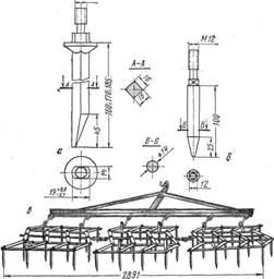 Зубья борон: а — квадратного сечения (тяжелой и средней борон); б — круглого сечения (легкой бороны); в — общий вид трехзвенной зубовой тяжелой бороны ЗБЗТУ-1,0.
