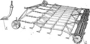 Трехзвенная лапчатая борона ЗБЗЛЛ.О: / — лапа; 2 — опорное колесо; 3 — прикатывающий каток