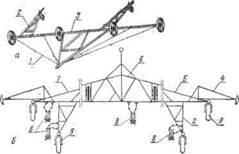 а — сцепка С-11У; 6 — сцепка СП-16; / — растяжка; 2 — удлинитель для прицепки заднего ряда машин; 3 — брус; 4 маркер; 5 — правое крыло; 6 — центральная секция; 7 — левое крыло; 8 — гидроцилиндры; 9 — опорные колеса.