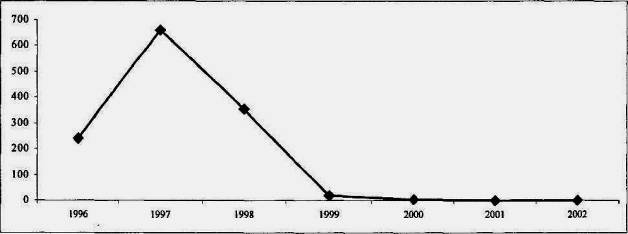 Кривая рисунка 1 указывает на то, что размер государственных средств, выделяемых на поддержку крестьянских (фермерских) хозяйств в Российской Федерации, возрастал лишь до 1997 года. Однако если учесть изменения покупательной способности рубля, резкое сокращение уровня государственной поддержки индивидуального предпринимательства в сельском хозяйстве стало происходить лишь с 1998 года. При этом динамика численности фермерских хозяйств коррелирует с динамикой оказываемой индивидуальному предпринимательству государственной финансовой поддержки.