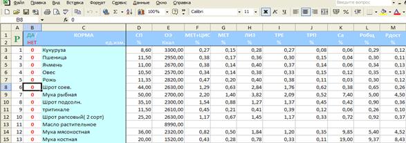 Для продолжения расчета на листе «Корма» необходимо определить кормовые компоненты, которые будут входить в состав рациона. По аналогии с предыдущими действиями определяются корма. Столбцу «Да/нет» также назначаем макрос Check.