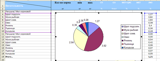 Для начала отобразим скрытую область ячеек с данными о питательности кормовых компонентов. Затем выполним команду вставить диаграмму. Определим тип «Круговая». Далее укажем два диапазона данных в режиме столбцы. Первым диапазоном будет столбец с названиями кормовых компонентов, вторым – столбец с питательностью данных компонентов по необходимому элементу (в нашем примере Лизин). Далее ставим флажок в подписях данных напротив значений и получаем готовый результат (рис. 22).