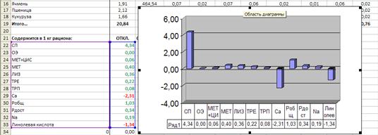 В результате мы получаем график, на котором отклонения от нуля отражают недостаток либо избыток питательного элемента в рационе. Составление данного графика можно автоматизировать путем записывания макроса. Выполним данное действие и полученный макрос назовем graph.