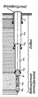 1 - кондуктор; 2 - обсадные трубы; 3 - сальники; 4 - надфильтровая труба; 5 - фильтрующая часть; 6 - отстойник фильтра.