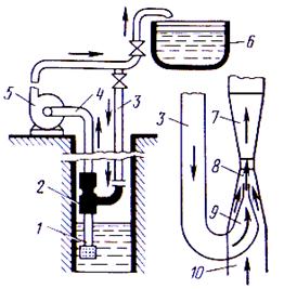 1 - всасывающая труба; 2 - водоструйный насос; 3 - напорная труба; 4 - подъемная труба; 5 - центробежный насос; 6 - бак; 7 - диффузор; 8 - смесительная камера диффузора; 9 - коническая насадка (сопло); 10 - всасывающий патрубок насоса.